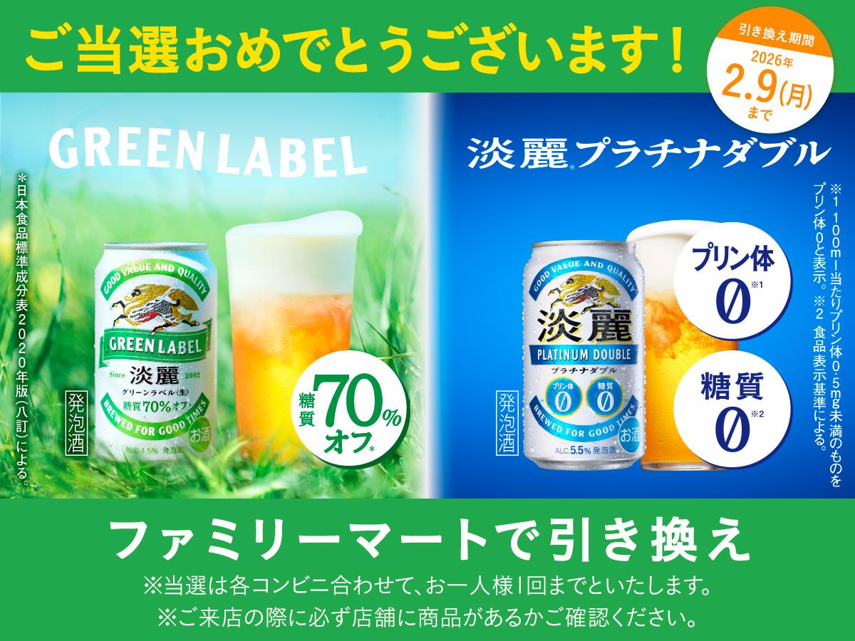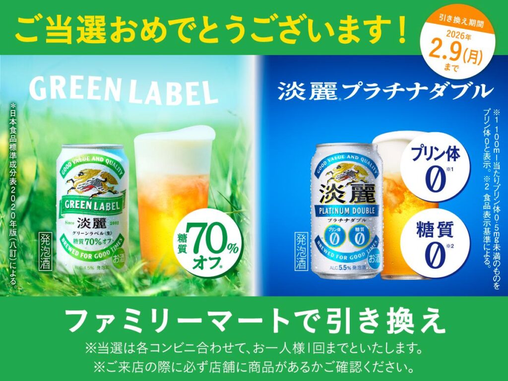 「26年1月『淡麗プラチナダブル・淡麗グリーンラベル』無料引き換えクーポン当たる!