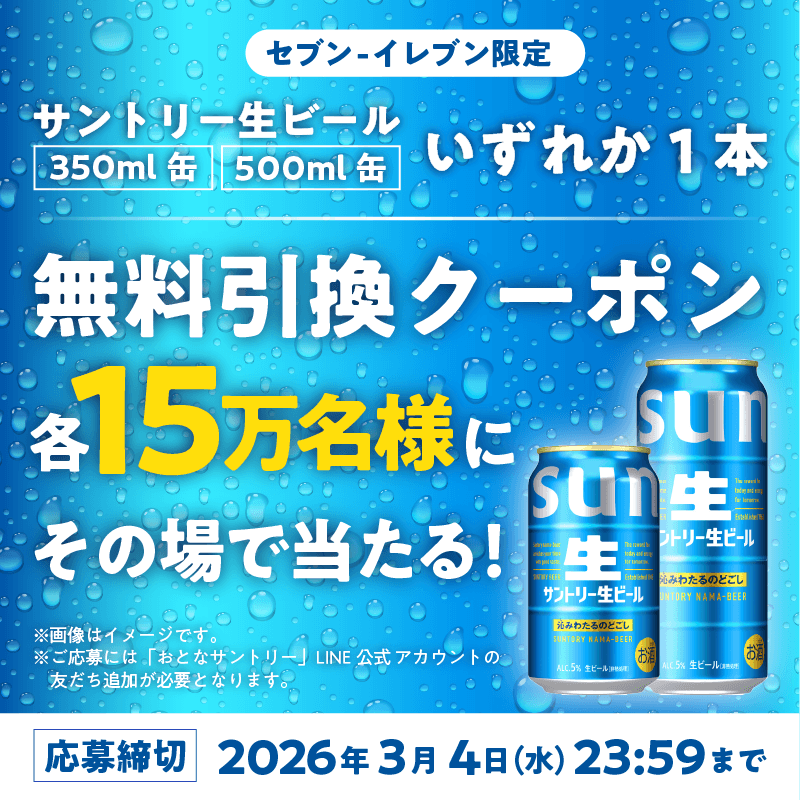 「『サントリー生ビール(350ml缶/500ml缶)』が各15万名様に当たるキャンペーン」です。
