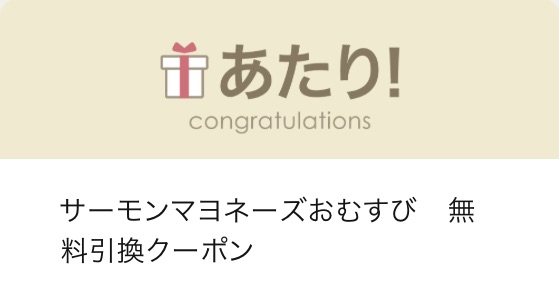 「サーモンマヨネーズおむすび」の無料引き換えクーポンをいただきました。
