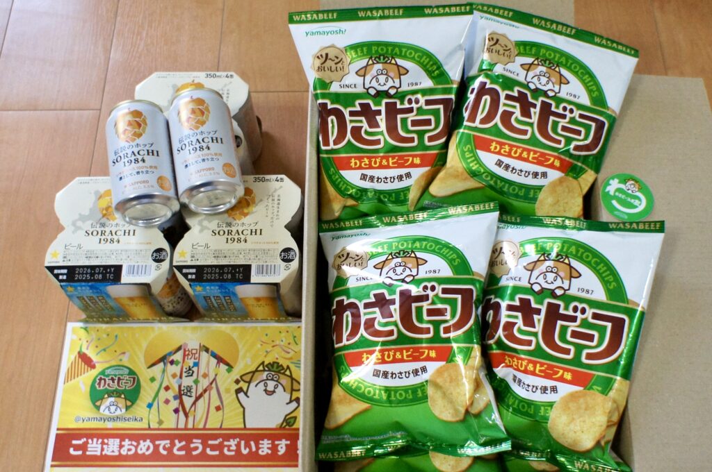「わさビーフ」1箱(12袋入)と「サッポロ SORACHI 1984」(350ml缶 × 12本)を